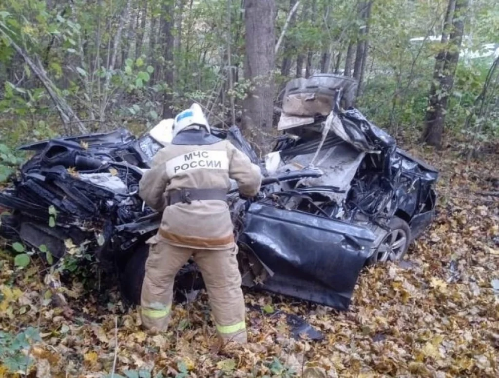 Машину смяло от удара об дерево. Водитель и его 21-летний пассажир скончались на месте происшествия до приезда скорой помощи.
