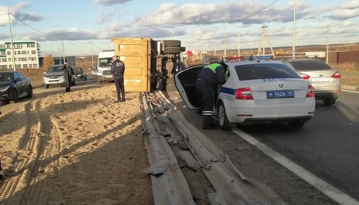 В Калуге 20-летний водитель перевернул самосвал на окружной дороге