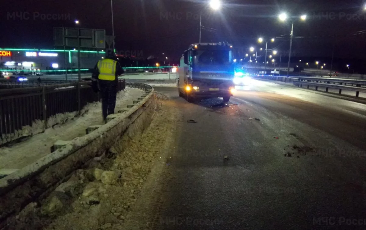 По предварительным данным, водитель грузового автомобиля МАН врезался в попутный «Рено». Обе машины двигались со стороны улицы Болдина и выезжали на мост в сторону Пучково.