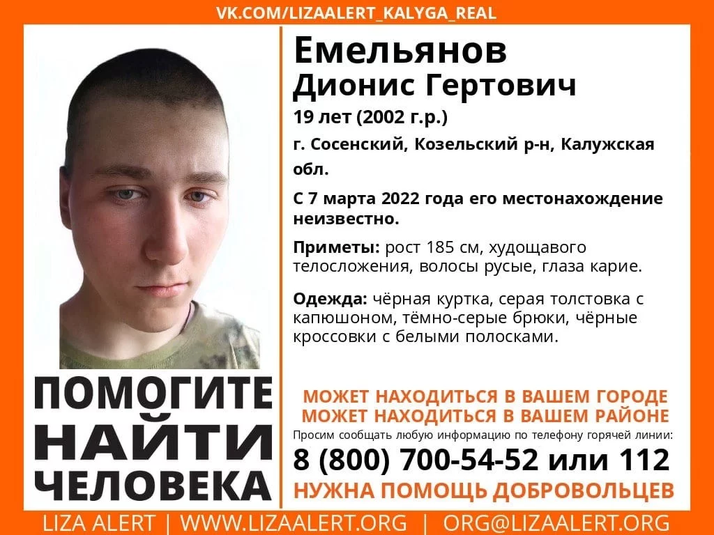В субботу, 19 марта, поисково-спасательный отряд «Лиза Алерт» сообщает о поисках 19-летнего Емельянова Диониса ГЕРТОВИЧА.