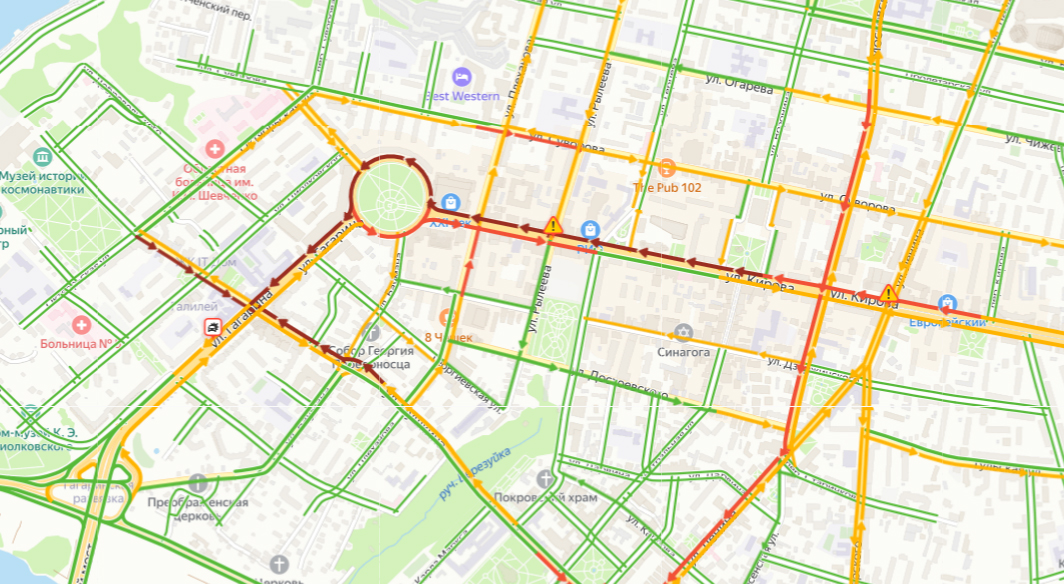 Пробка на улице Кирова в сторону сквера Мира растянулась от Театральной площади. На Королева машины стоят до парка Циолковского и улицы Баумана.
