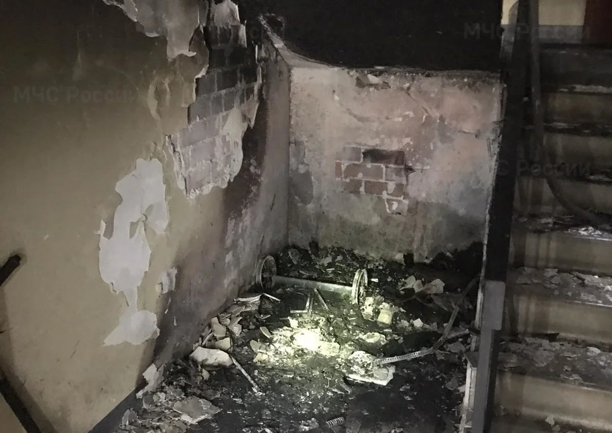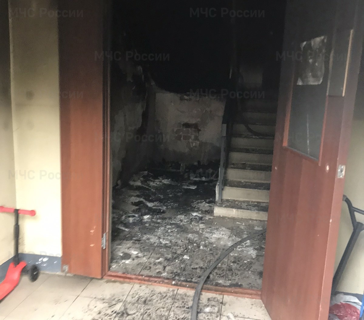По предварительным данным, кто-то поджег коляску, стоявшую возле лестницы. Огонь полностью уничтожил детский транспорт, сильно закопчены стены во всем подъезде.