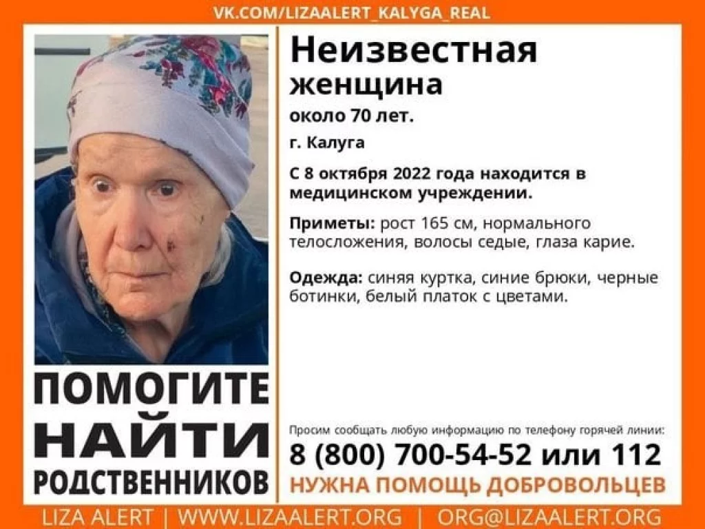 Калужан просят помочь установить личность и найти родных, близких или знакомых неизвестной пожилой женщины. Объявление разместили в воскресенье, 6 октября, в поисково-спасательном отряде «ЛизаАлерт».