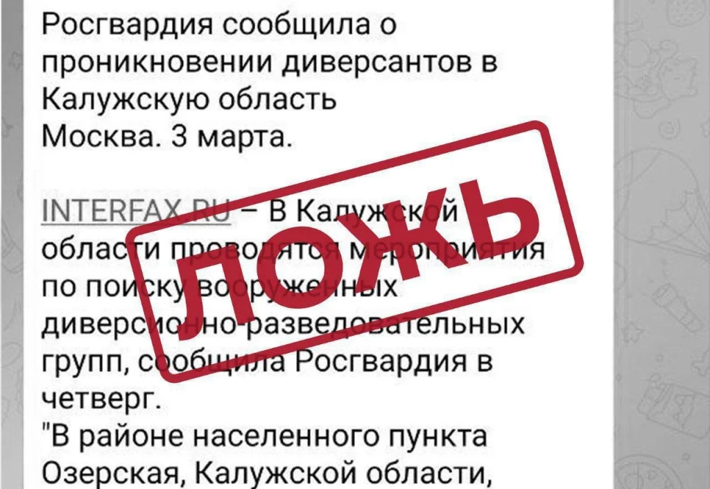 В пятницу, 3 марта, по социальным сетям и мессенджерам начали распространяться сообщения о проникновении неких диверсантов на территорию Калужской области. К ним прикрепляется якобы скриншот с сайта информационного агентства «Интерфакс».