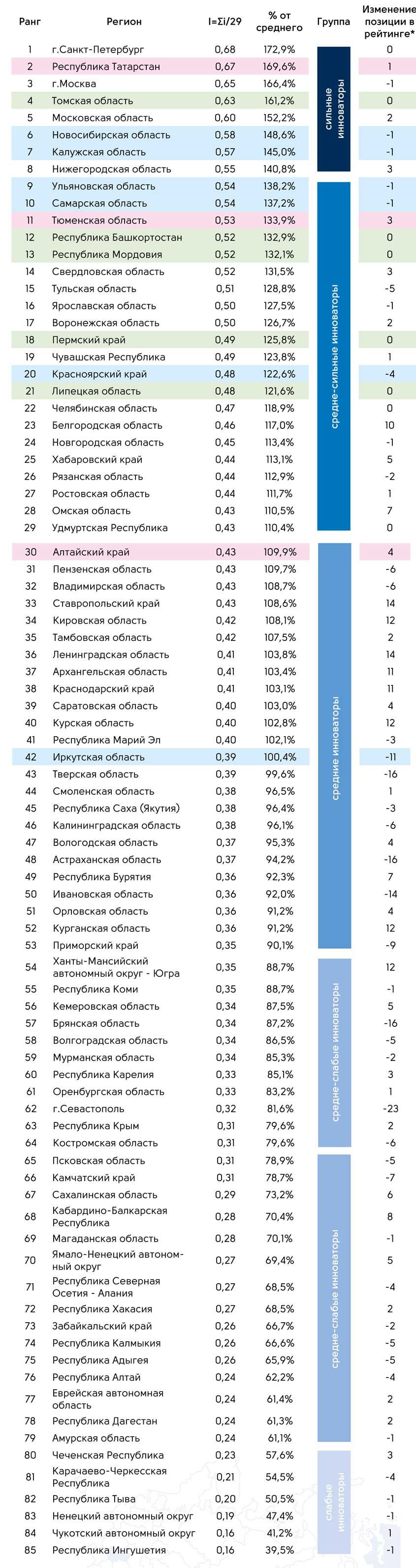 По словам составителей, основу методики формирования рейтинга положен подход, используемый Европейской комиссией для проведения сравнительной оценки инновационного развития регионов Евросоюза. Все субъекты РФ поделены на несколько групп: