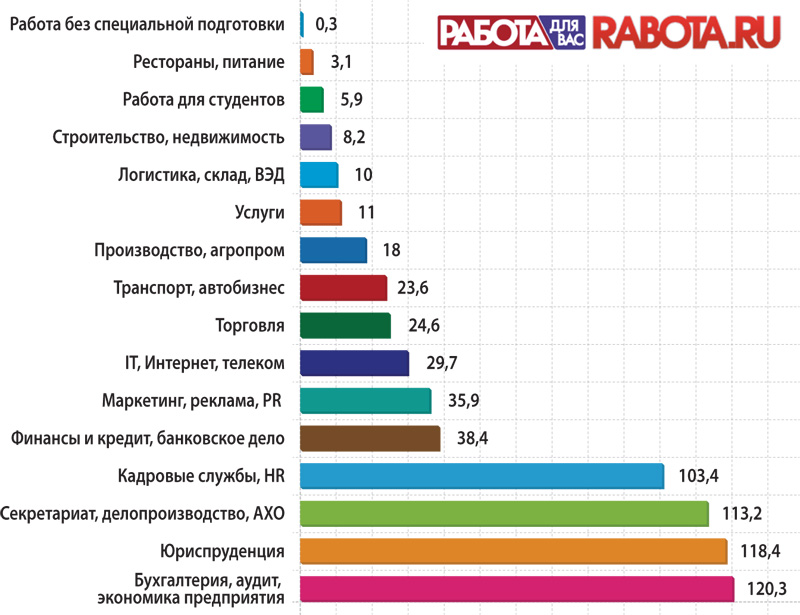 А вот для желающих работать юристами, бухгалтерами или секретарями положение на рынке труда гораздо сложнее. Конкурс среди кандидатов очень велик: на 1 открытую вакансию приходится более 115 резюме!