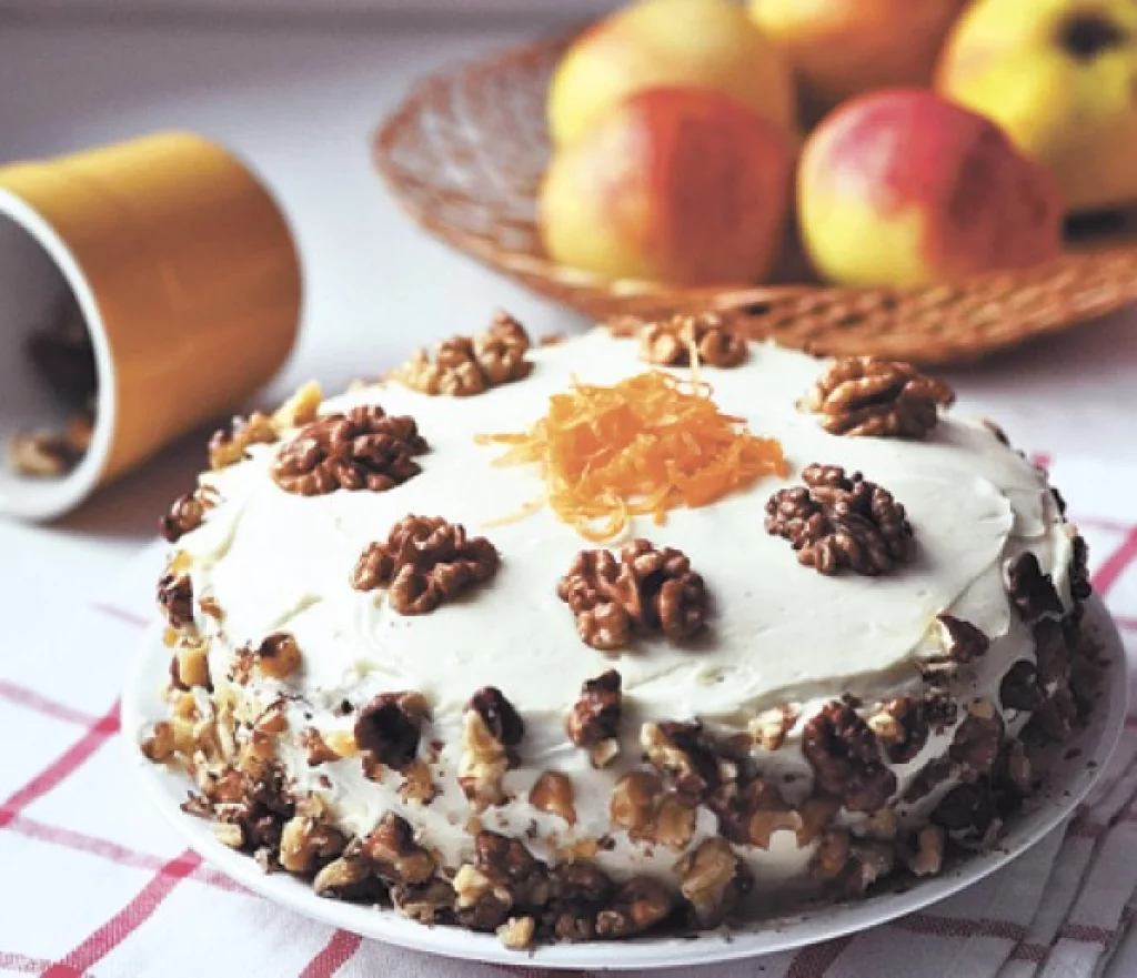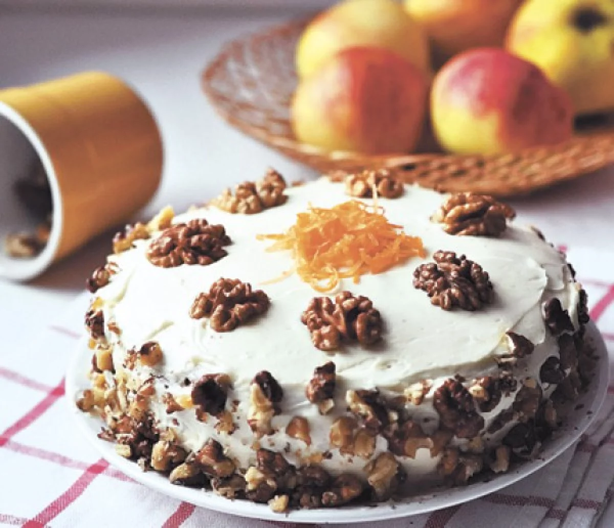Орехи обжарить в духовке. Сахар смешать с маслом. Залить смесь соком. Морковь натереть на мелкой терке. Орехи смолоть в блендере не очень мелко. Отложить несколько штук для украшения. Молотые орехи добавить к смеси, перемешать. Муку смешать с разрыхлителем и ванилью. Добавить к смеси и хорошо перемешать. Вылить тесто в форму и выпекать 40 минут в заранее разогретой духовке при температуре 200°C. Готовый торт остудить — сначала в форме, а затем на решетке. украсить по своему желанию и вкусу. Можно корж разрезать пополам. Тот, кто не постится, может промазать коржи сливочным сыром, взбитым с сахарной пудрой.