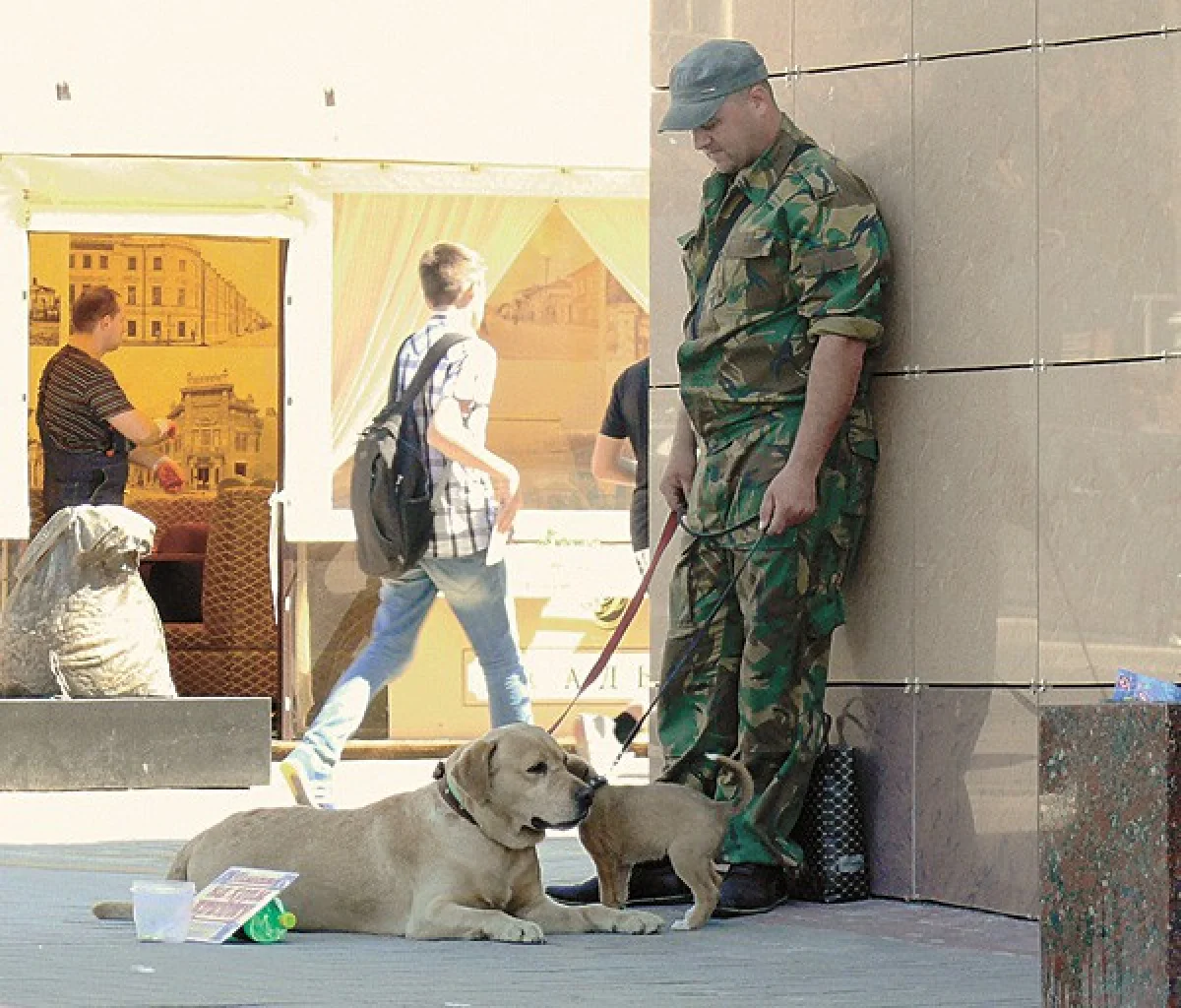 Погладить собачку можно, но больше приветствуется немного денег «на корм приюту». Именно эта фраза значится на табличке, лежащей рядом с животными. Любопытным мужчина в камуфляже охотно рассказывает, что сам он недавно приехал из Тулы. А деньги собирает на собачий приют в Подмосковье.