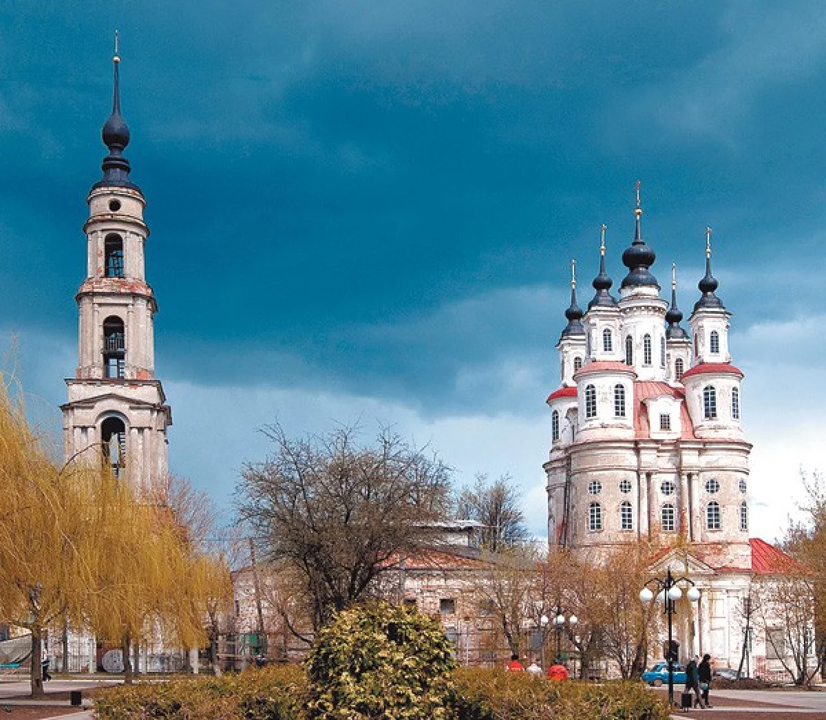 Церковь Космы и Дамиана. Одно из красивейших зданий в редком для Калуги стиле баррокко.