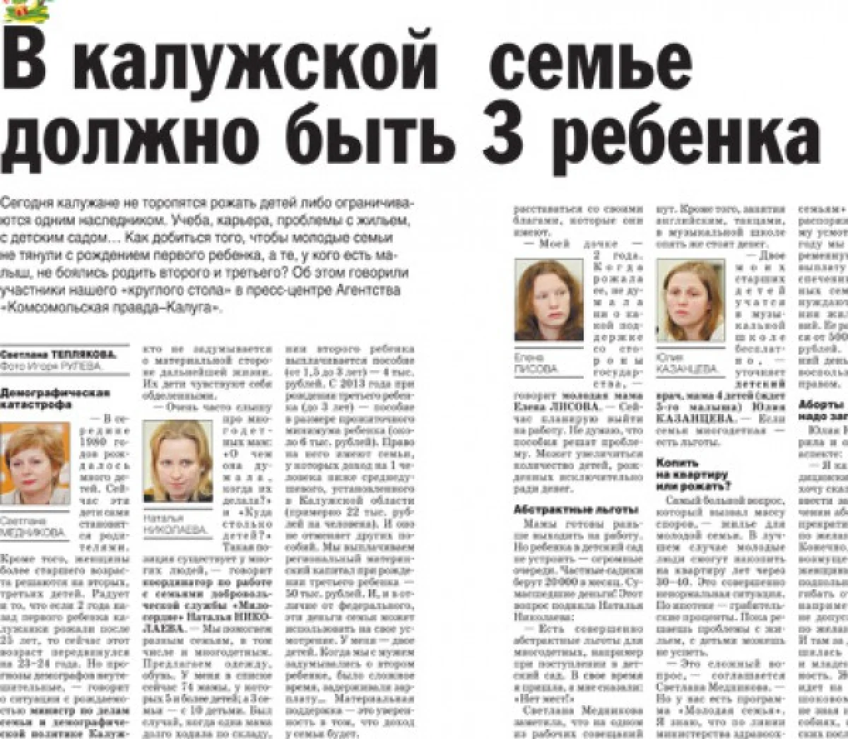 Здравствуйте! Прочитала статью «В калужской семье должно быть 3 ребенка» и не смогла удержаться от комментария. У нас с мужем — трое детей. Рожали, не задумываясь, будет поддержка от государства или нет. Понимали, что дети — это огромная ответственность и финансовая нагрузка. Я не жалуюсь, дети живут не в роскоши, но одеты, обуты, накормлены. Мы получили и федеральный материнский капитал, и региональный, оформили пособие на ребенка, рожденного в 2013 году, на работе получаю пособие по уходу за ребенком до 1,5 лет. И все! Остальные пособия рассчитываются исходя из прожиточного минимума. Мы не можем воспользоваться ни одним другим пособием, ни одной другой льготой или субсидией, потому что мы НЕ НИЩИЕ! Мы вполне работоспособные люди, оба — с высшим образованием, с небольшой, но стабильной зарплатой. Муж сейчас работает один, получает в среднем 30 тысяч, но все равно это много, по доводам государства. С такой зарплатой нас никогда не признают малоимущими, хотя реально денег не так уж и много (у нас к тому же еще ипотека). Мы с такими доходами не можем подать на субсидию на улучшение жилищных условий, хотя метров на всех не хватает. Не смогли собрать и документы по программе «Молодая семья». Подали заявку на земельный участок, но в очереди — 500 с хвостиком, а за год выделено около 20 участков. Такими темпами землей сможем воспользоваться в глубокой старости, но к тому времени может оказаться, что дети выросли и мы потеряли статус многодетности. Не проходим и на бесплатное питание в школе для старшей дочери, на какие-то компенсации на оплату коммунальных услуг. Повторюсь: я не жалуюсь, не претендую на что-то со стороны государства, спасибо огромное за то, что получили вышеуказанное. Просто бесит, когда кричат: вот, многодетным столько всевозможных льгот! А в реальности же воспользоваться ими могут те, кто бездельничает, или у кого есть возможность предоставить липовые справки о доходах. Обычному человеку и обычной семье — такой, как наша, — мало что светит. Так что сейчас, на мой взгляд, многодетные — те, кто сам мало-мальски стоит на ногах, здраво оценивает свои возможности, или халявщики, желающие жить полностью за счет государства. Спасибо за возможность высказаться.