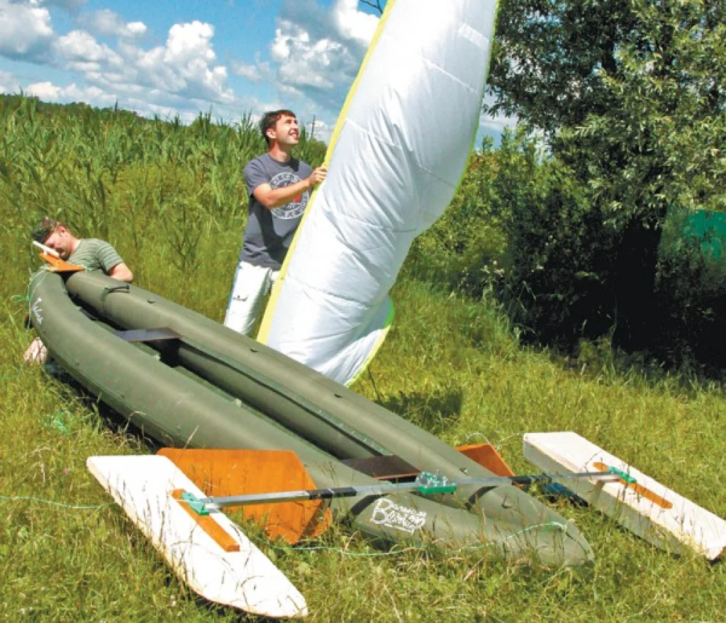 Недавно на калужском водохранилище мы застали двоих молодых людей, которые на травке собирали необычную конструкцию - к надувной лодке прикрепляли паруса.