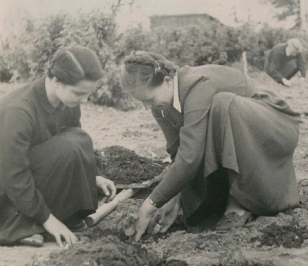 Лидия Васильевна и ее ученица — юннатка Валя Соколова — впервые сажают