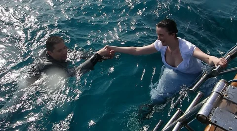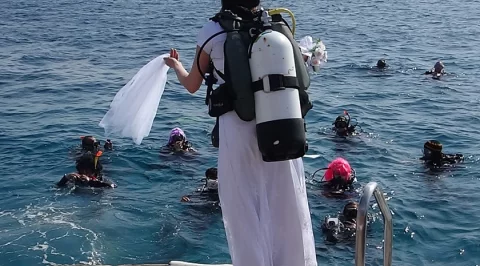 После подводной регистрации свадьба продолжилась на палубе — с танцами, тостами и настоящим тортом, который в подарок испекла египетская команда, растрогав молодоженов и гостей. Но самым невероятным было то, что на свадьбу приплыли дельфины.
