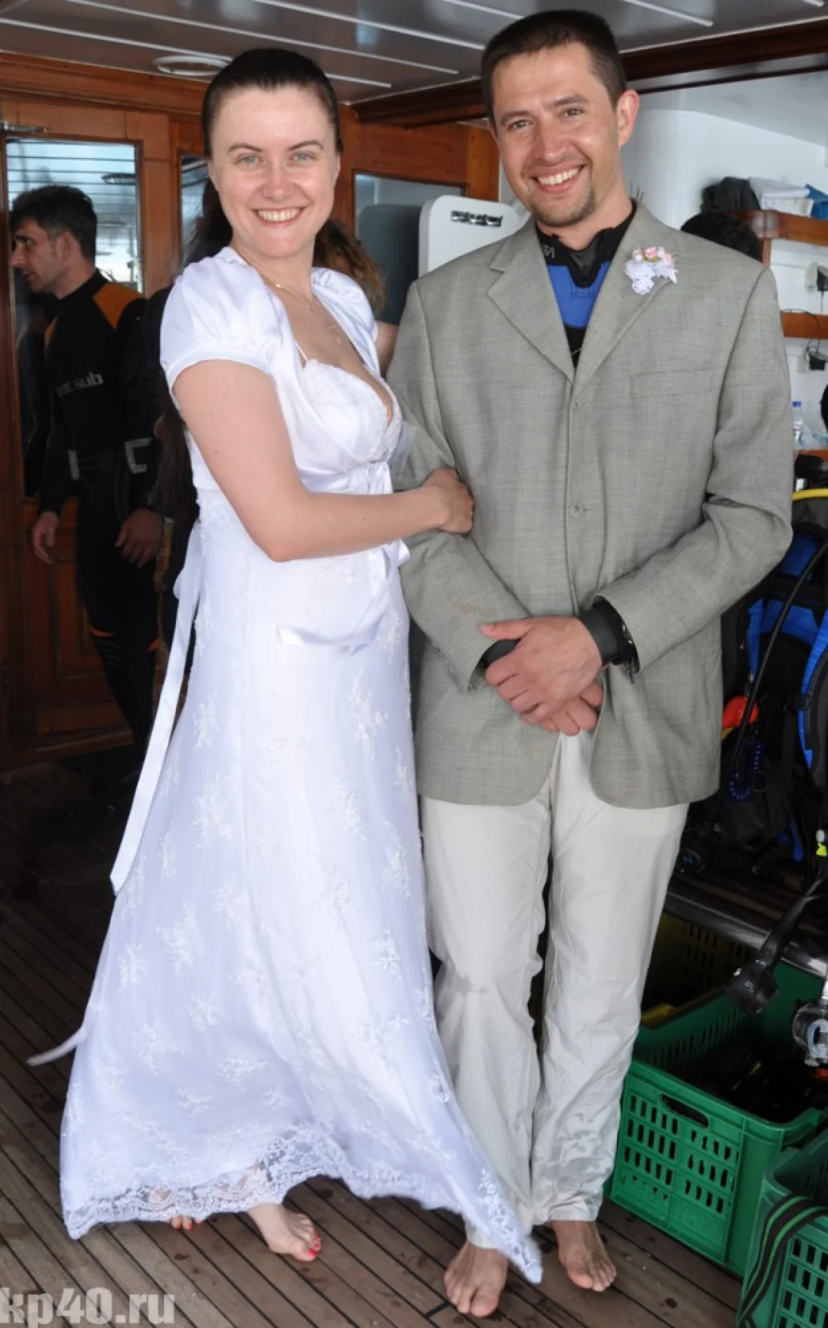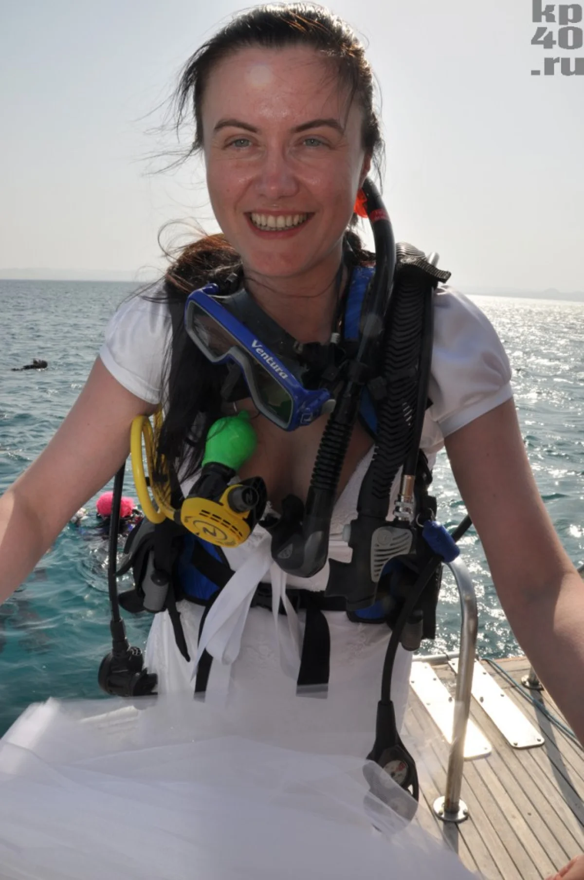 — У меня было шикарное белое платье по фигуре, потому что пышное могло подняться на воде куполом, — говорит Анна. — Платье подарили наши друзья — дайверы с 6-летним стажем и владельцы свадебного салона Галина и Дмитрий Лукьяновы. Это было очень приятно. Наряд нетяжелый — к баллонам мы добавили всего 2 кг груза. Необычно вела себя фата: под водой она всплывала вверх как символ окончательной капитуляции!
