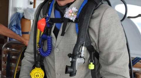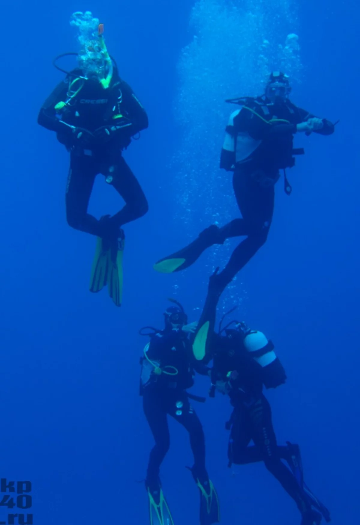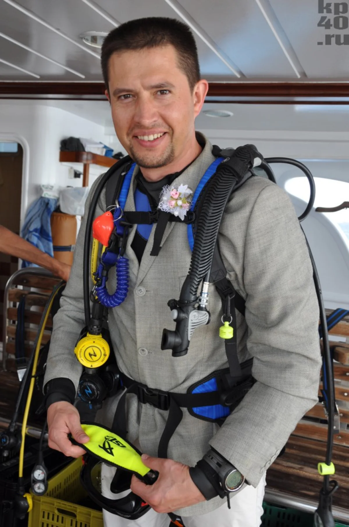 — Я погрузился первым и сел на ящичек, — рассказывает «Нептун» — руководитель Калужского подводного клуба Анатолий НАТАЛЕНКО. — Было такое комфортное состояние, что я даже задремал, пока ждал молодых. Потом подплыли Влад и Аня, я начал проводить церемонию. У меня в руках был планшет, на котором молодожены специальным подводным карандашом поставили свои подписи. Ребята обменялись кольцами и скрепили свой союз поцелуем. Событие отметили безалкогольным шампанским — сделали по глотку. Пить на глубине умеют только очень опытные дайверы — можно легко наглотаться соленой морской воды.
