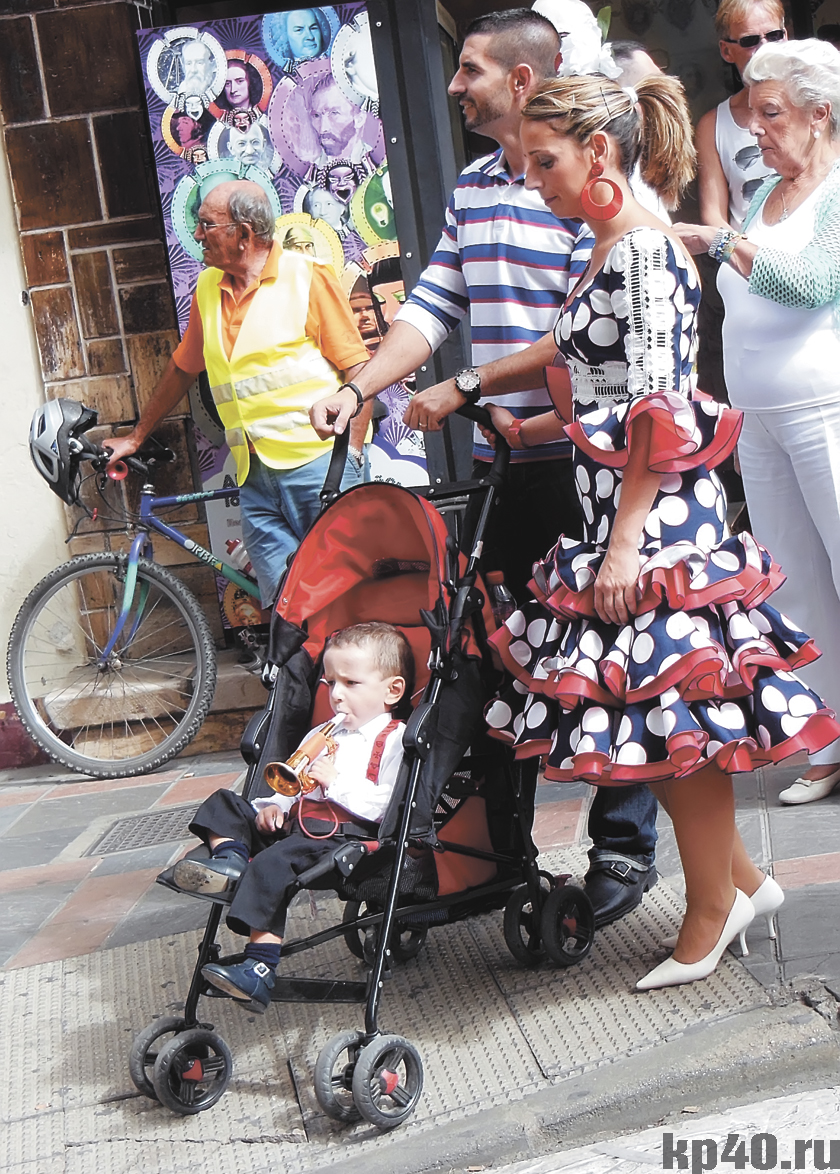 К празднику жители города готовятся задолго до фэрии, шьют костюмы. Никто не наряжается в смурфиков, стрекоз, индейцев, пиратов и гангстеров. Все красуются в национальных одеждах. И если мужчинам особо напрягаться не обязательно (шляпа, кушак да сапоги), то женские наряды — это особый разговор. В национальные платья одевается почти все женское население. Даже те, кому еще нет и года от роду. Везут, к примеру, молодые родители гордо так перед собой коляску, а в ней не менее гордо восседает крошечная нарядная сеньорита с цветком и расшитым платочком в руке или мини-сеньор! Нет, не с игрушечными пистолетом или саблей. С трубой или барабаном. И платочками машут, и в трубы трубят эти маленькие испанцы в такт музыке. А я просто шалел от разнообразия великолепных национальных платьев! Оказывается, этот «кармэн-костюм» есть у каждой уважающей себя испанки. Их шьют, бережно хранят и передают по наследству. На них есть особая мода. Им посвящены целые каталоги!