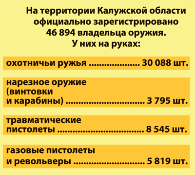 Всего же за 10 месяцев этого года полиция уже насчитала 24 случая, когда калужане использовали оружие по поводу и без и попали под уголовную ответственность. Пострадали 25 человек.