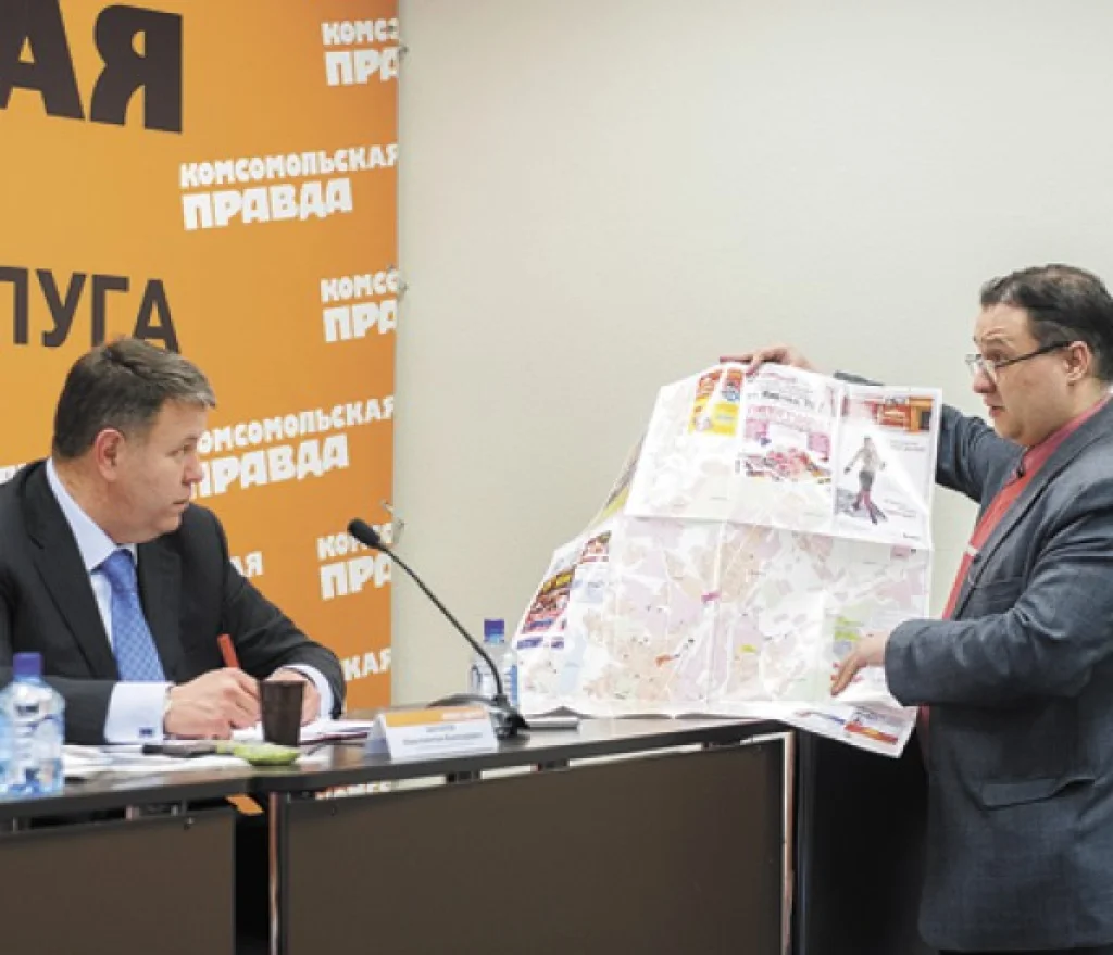 Наш коллега Михаил Борисов пришел на пресс-конференцию не только с вопросами, но и с подарком — он презентовал исполняющему полномочия городского головы так называемую «карту городских бед». На обычной карте Калуги Михаил обозначил около 12 «болевых точек».