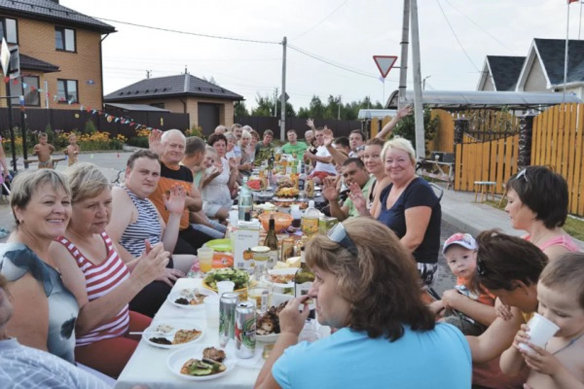 В этот раз из-за жары собирались в 7 часов вечера, хотя обычно начинаем в 5. Украсили улицу, развесили флажки, шарики. Вынесли столы, накрыли их. Каждый несет то, что приготовил. Столы ломятся! Четыре пиццы испекли. Они сразу разошлись, дети с удовольствием съели. Баклажаны получились вкусные. К чаю — блины с бананами, пирожные, конфеты. И, соответственно, еще… мы же русские люди!
