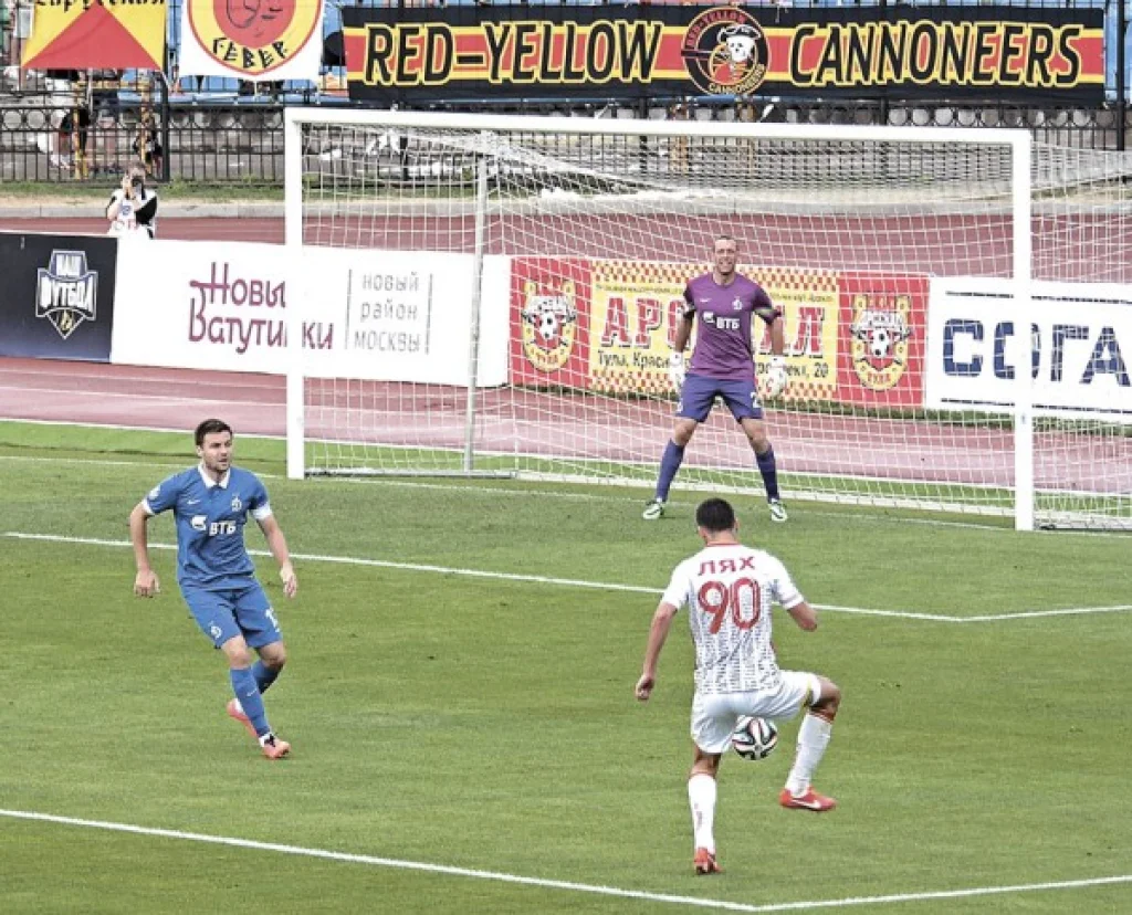 Первые полчаса прошли в относительно равной борьбе. Тула — по-настоящему футбольный город. Весь стадион в едином ритме скандирует: «Только Тула будет первой — ХЭЙ-ХЭЙ!» Это традиционная кричалка тульских болельщиков.