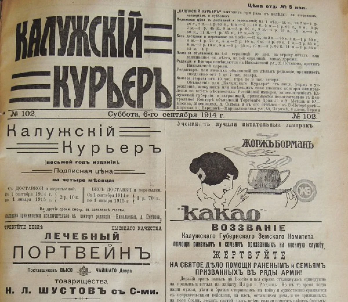 Сейчас в Доме Шамиля проходит выставка, посвященная 100-летию начала Первой мировой войны. Там можно узнать, как жил наш город в 1914 году, где находились госпитали, а также увидеть фото семей, в которых были участники Первой мировой. Готовясь к выставке, сотрудники Краеведческого музея изучали старые газеты. Получилась интересная подборка статей. И теперь мы можем узнать, что происходило в Калуге ровно 100 лет назад.