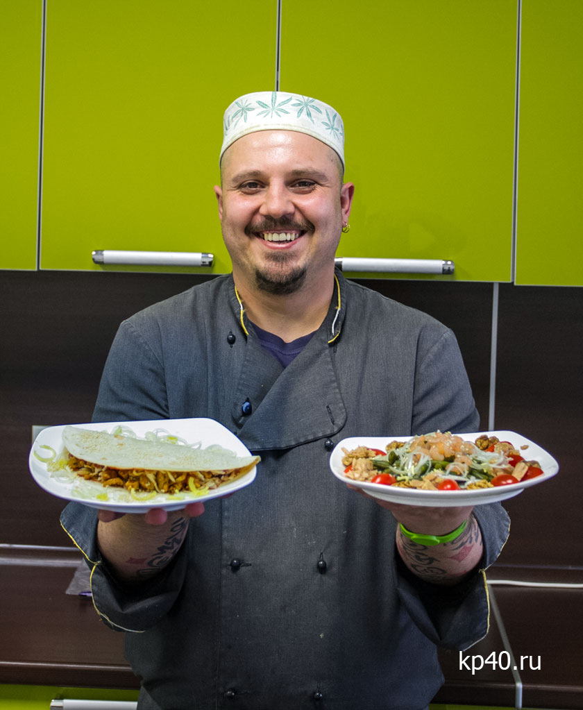Несмотря на нехватку времени, Алексей всё-таки находит несколько минут на то, чтобы дать нам небольшой мастер-класс по приготовлению салата со стручковой фасолью, коктейльными креветками, консервированным тунцом и грецким орехом, а также мексиканского национального блюда «Кесадилья».