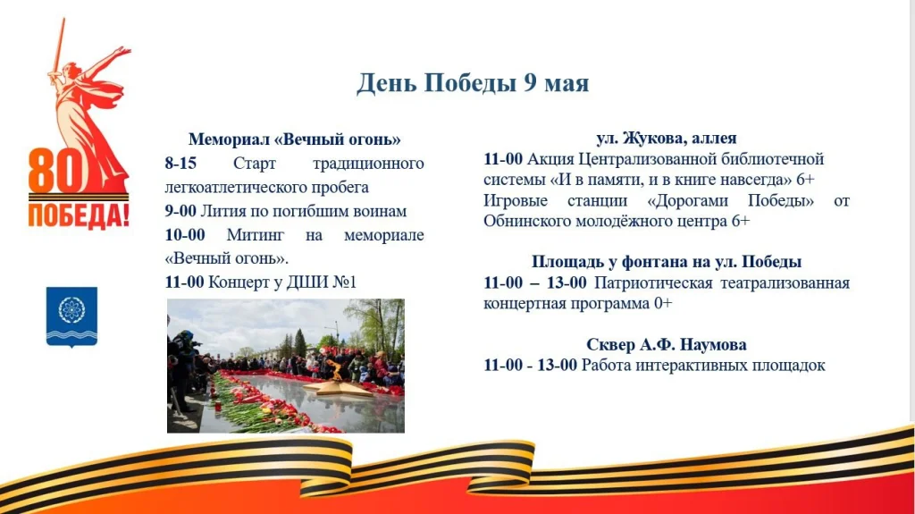 Программа включает как традиционные события, так и новые форматы, призванные объединить горожан в честь праздника. Центральным событием станет торжественный митинг у мемориала «Вечный огонь», где жители почтут память героев.