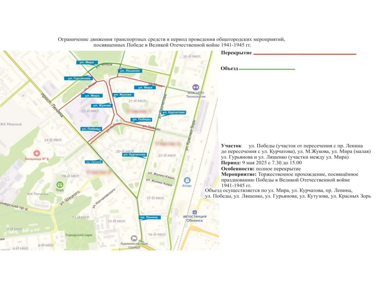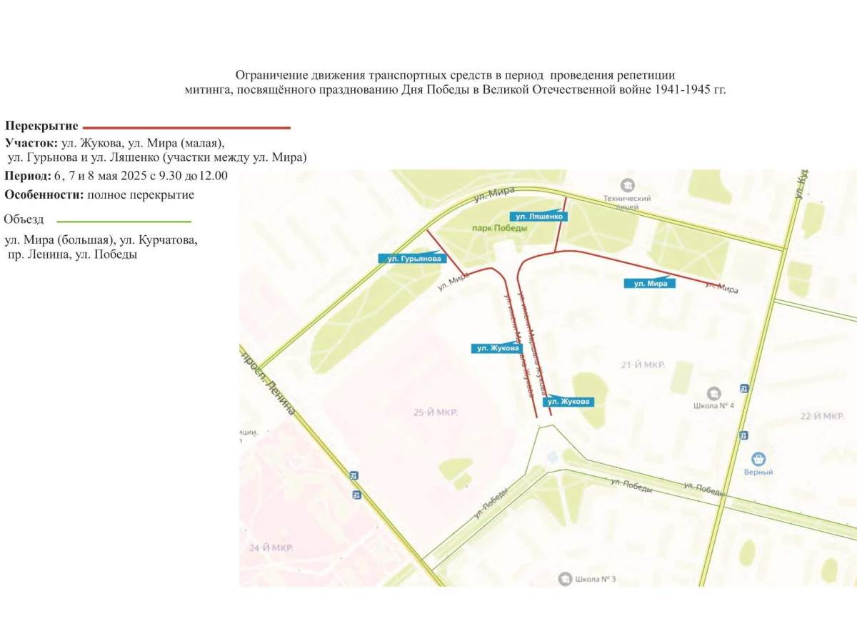 6, 7, 8 мая с 9:30 до 12:00 нельзя будет проехать на пересечении улиц Мира и Жукова, частично на улицах Ляшенко и Гурьянова.