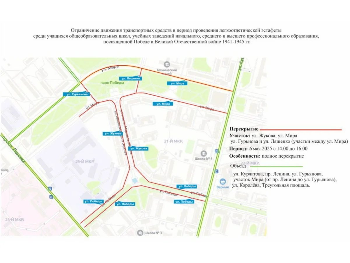 В эти дни пройдут различные мероприятия, посвящённые 80-летию Победы в Великой Отечественной войне. 6 мая с 14:00 до 16:00 будет закрыто движение на улице Жукова, частично на улицах Победы, Мира, Ляшенко и Гурьянова.