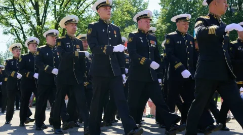 В воскресенье, 27 июля на улицах наукограда много военных в красивой морской форме.