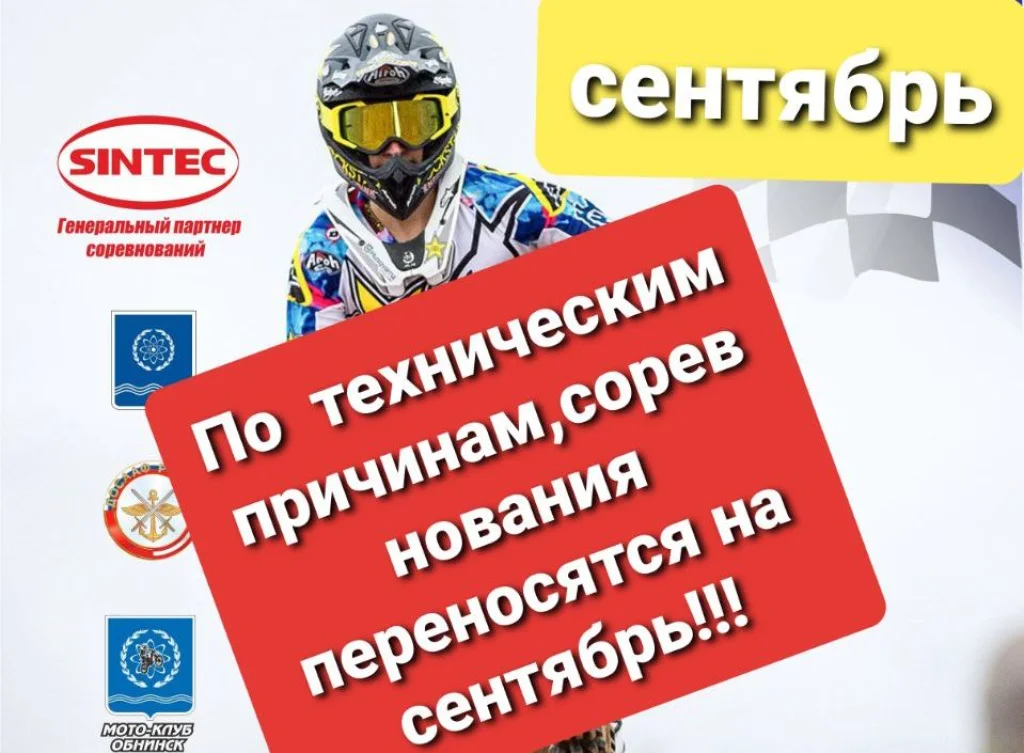 Межрегиональные соревнования по мотокроссу в Обнинске в очередной раз не состоятся в намеченные сроки. После того как старт был перенесен с 19 июля на 2 августа из-за дождей и гроз, организаторы приняли решение отложить мероприятие до сентября по техническим причинам.
