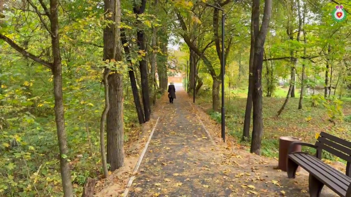 Тротуар ведет к больнице, спортивной школе и остановке. Оборудованы освещение и места отдыха.