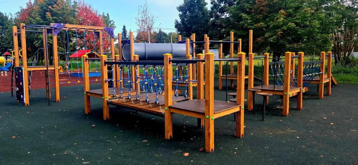 На детской площадке установили новые качели, песочницу, а также городок с горками. Для безопасности предусмотрено резиновое покрытие.