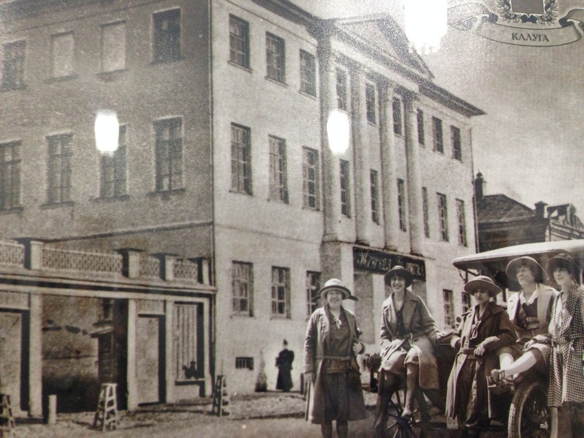 Однако поблизости от реалистичных гравюр с уютными городскими улочками - целый блок странных фото старой Калуги начала ХХ века. Их Ляпичев дополнил людьми и разными техническими объектами, например летающей тарелкой, приземлившейся рядом с Гостиными рядами.