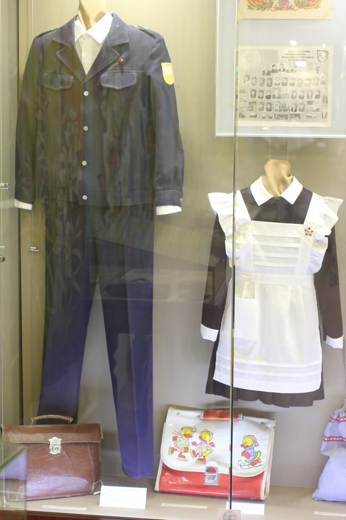 Много на выставке и экспонатов ХХ века: школьная форма, портфели, ранцы, буквари, тетради.