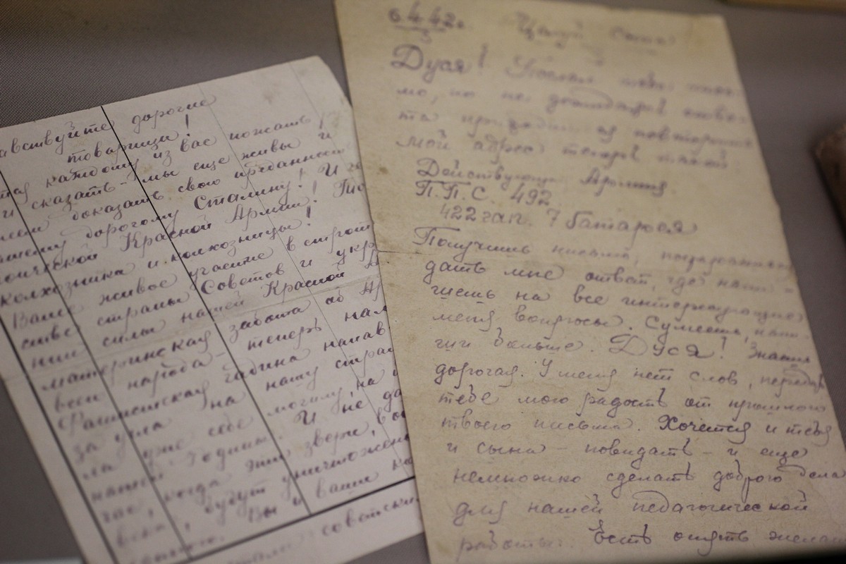 В соседней витрине – письма с фронта козельского учителя Бориса Сорокина, трогательные, в них много описаний, чувств. Жена Сорокина читала их его ученикам. Последнее письмо пришло в 1942 году. Сорокин с войны не вернулся, пропал без вести. Родственники передали его письма в музей.
