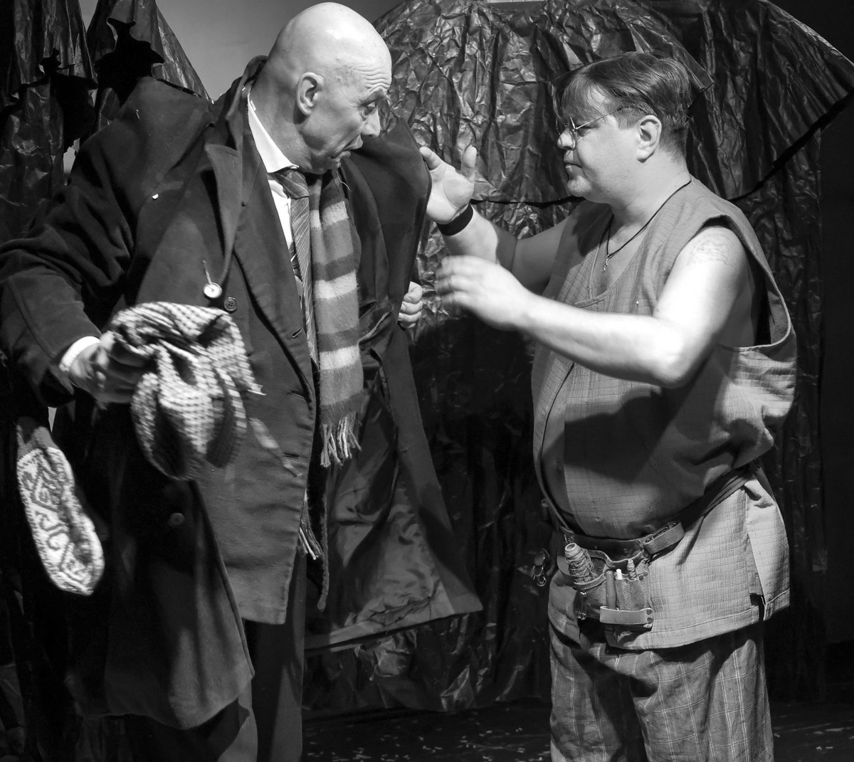Как сказано в аннотации к спектаклю: на сцене – клоунада, сдобренная чёрным юмором и нелепицами.
