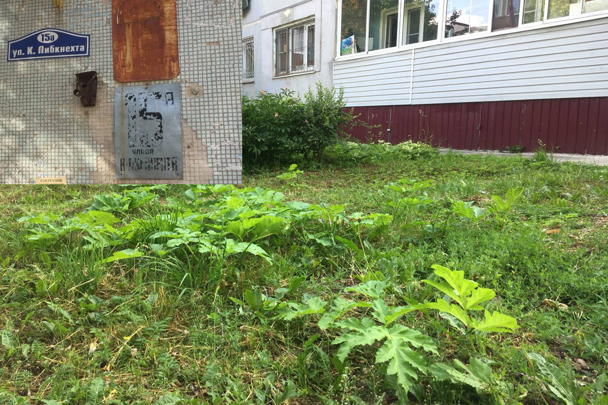 Жители домов на улице Карла Либкнехта в Калуге с опаской выходят выгуливать своих домашних питомцев на лужайку за домом номер 15А – привычное место выгула собак. Не пускают сюда гулять и детей. Причина в разрастающихся зарослях борщевика.