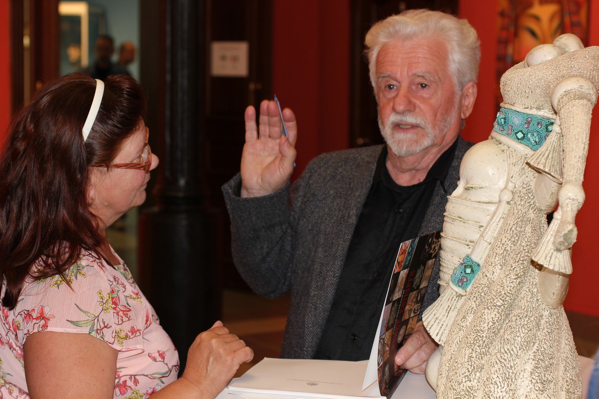 На вернисаже столичный художник Сергей Феофанов сразу разрешил трогать и щупать все его скульптуры, сказав, что сам везде так делает, чтобы почувствовать.