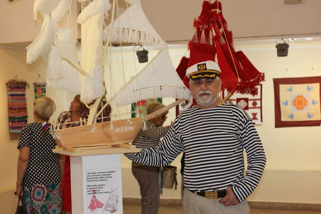 Самые эффектные экспонаты на вставке – два корабля, которые сделал Григорий Кочубей. С этими кораблями перефотографировались все гости вернисажа. А сам автор позировал в тельняшке и морской фуражке. Григорий Кочубей – мастер по дереву, а несколько лет назад увлекся ткачеством.