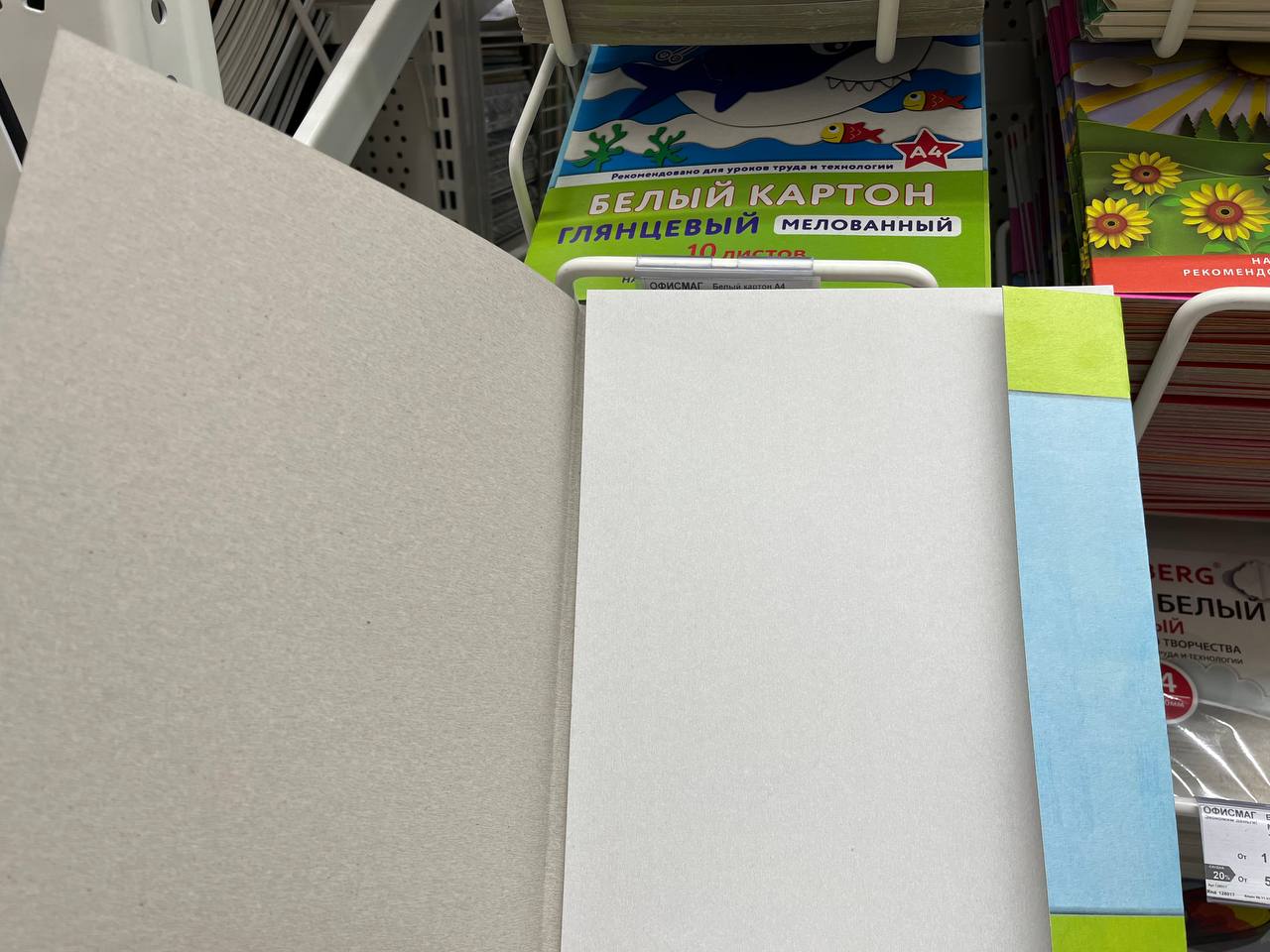 Тот самый якобы белый картон за 70 рублей. Слева - внутренний цвет обложки, справа - лист самого картона для творчества.