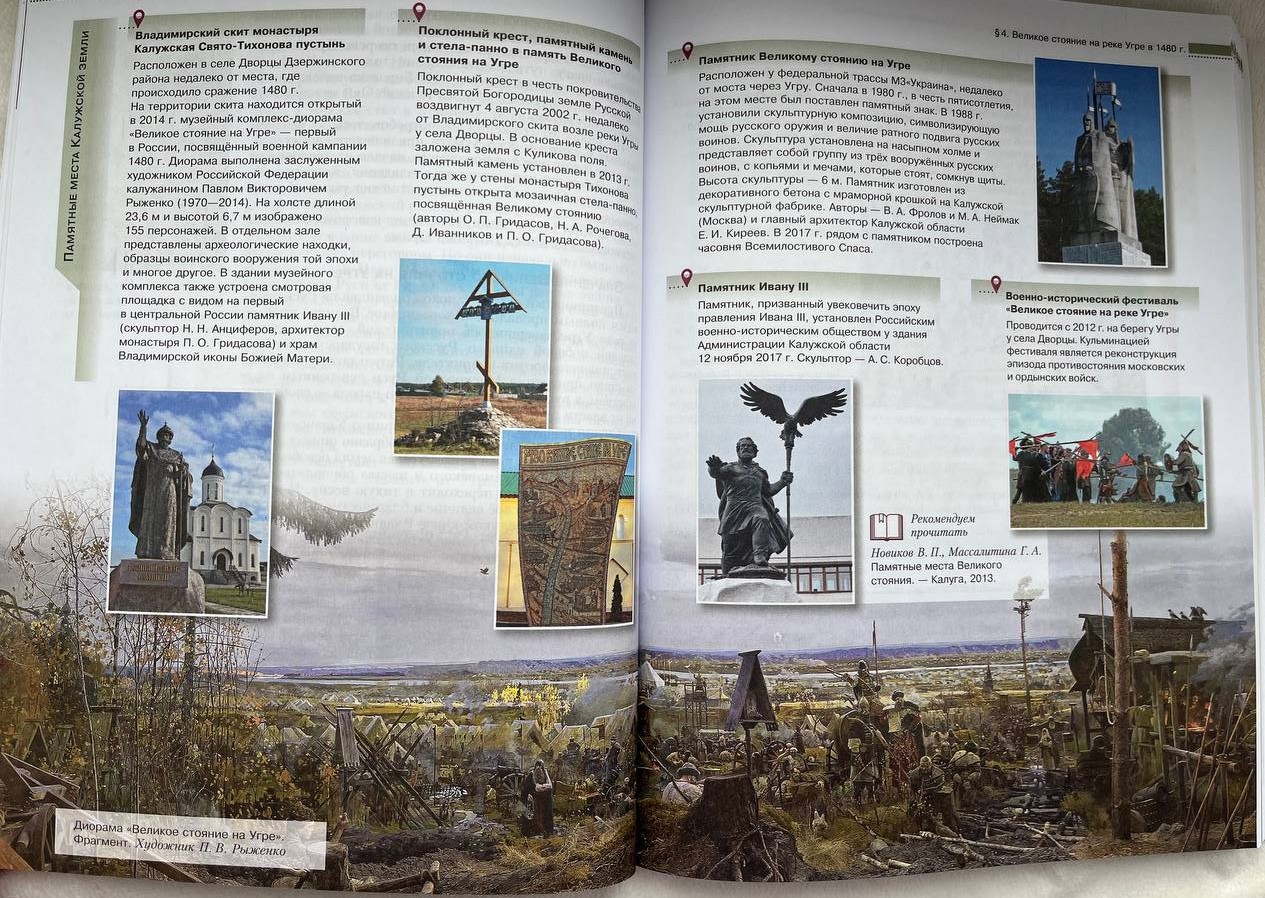 В конце параграфа расположены вопросы и задания, многие из которых мотивируют учеников углубить свои знания, заняться некой исследовательской деятельностью. Учебное пособие «История Калужского края» рассказывает о выдающихся людях, о монастырях и усадьбах, промышленных предприятиях и памятных местах региона.