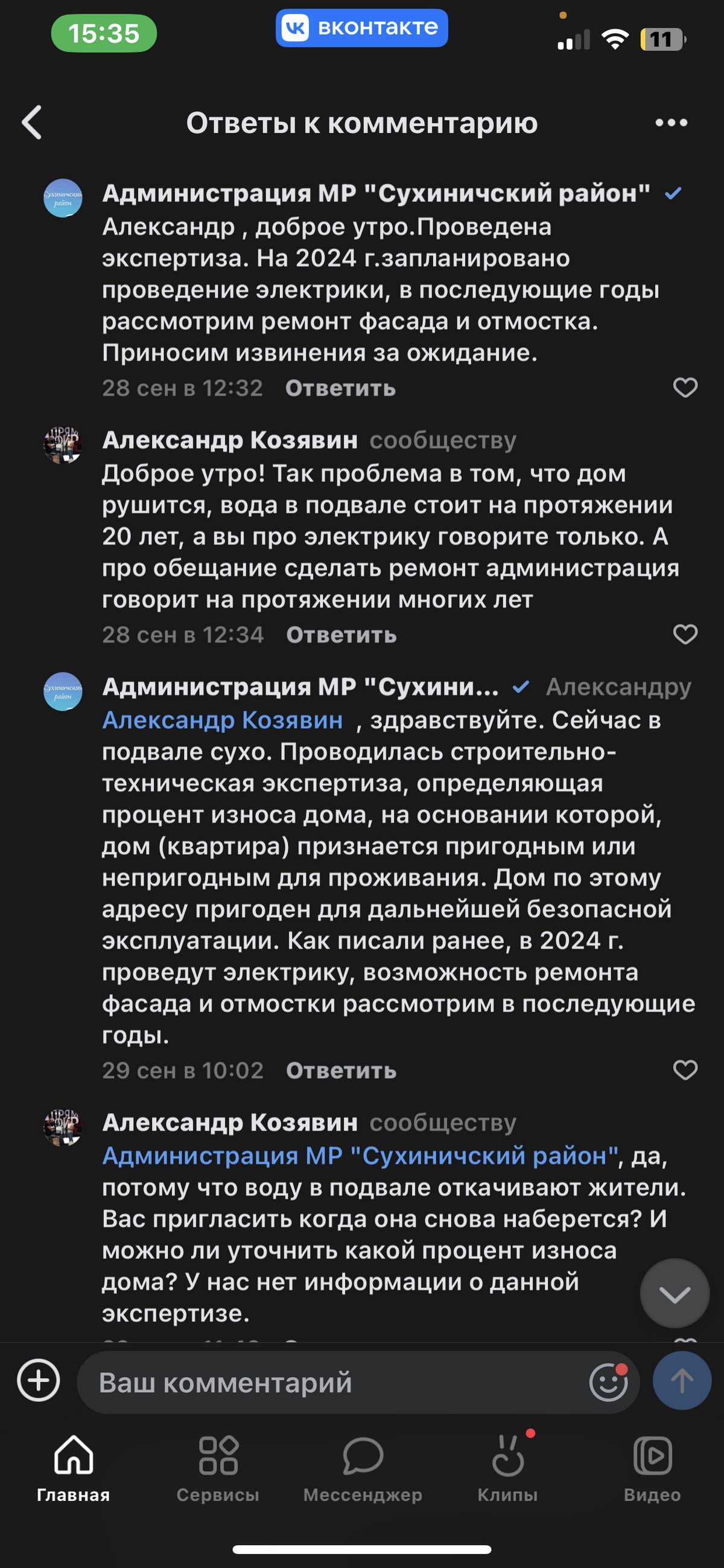 Собрали собрание, приезжал глава администрации ГП «Город Сухиничи» Андрей Голиков, обещал поставить на 2025 год наш дом на капремонт, дал письмо, что в 2024 году будут делать проектную документацию. Надеемся!