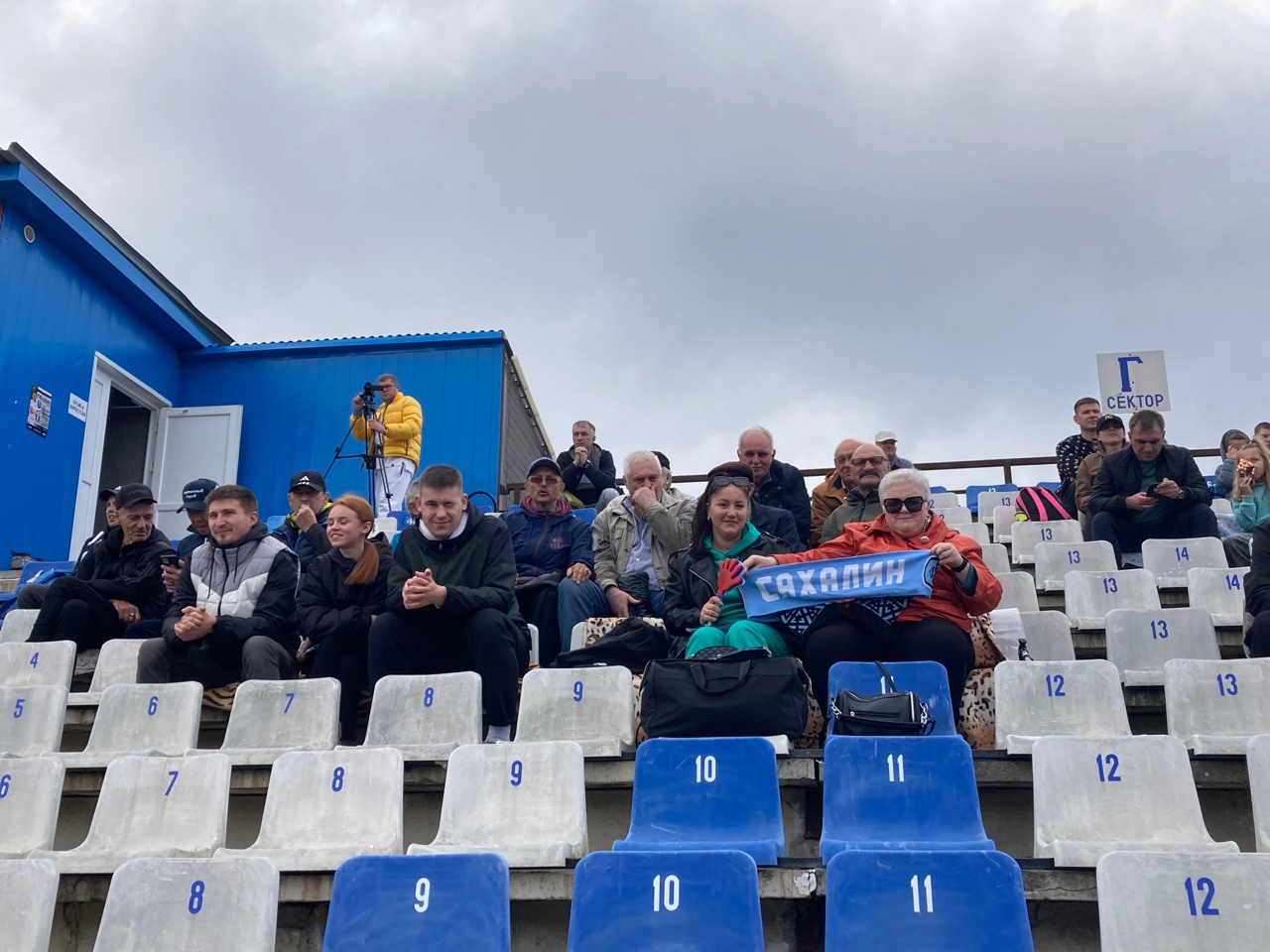 Сахалинцы болеют за свою команду на стадионе с видом на горы.