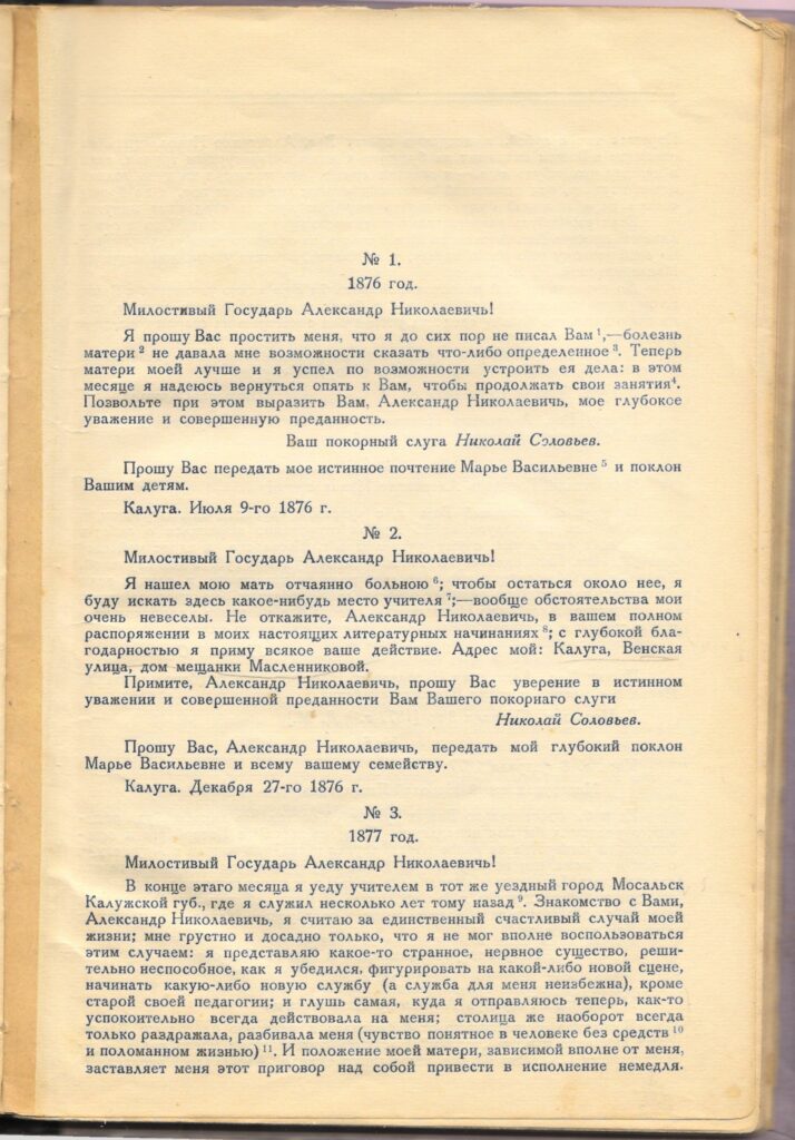 Сотрудничество с Островским длится четыре года, но и потом они сохранили дружеские отношения и переписывались до самой смерти Островского. Было написано 191 письмо, из них 82 – Островским, 109 – Соловьевым.