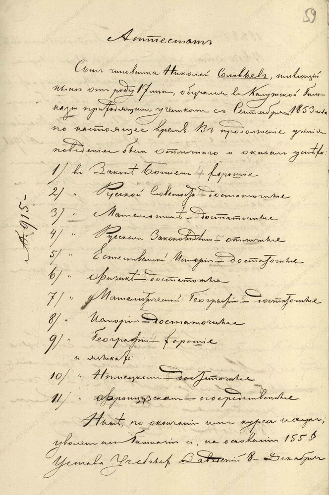 В аттестате за 1861 год значится, что Николая Соловьеву 17 лет.