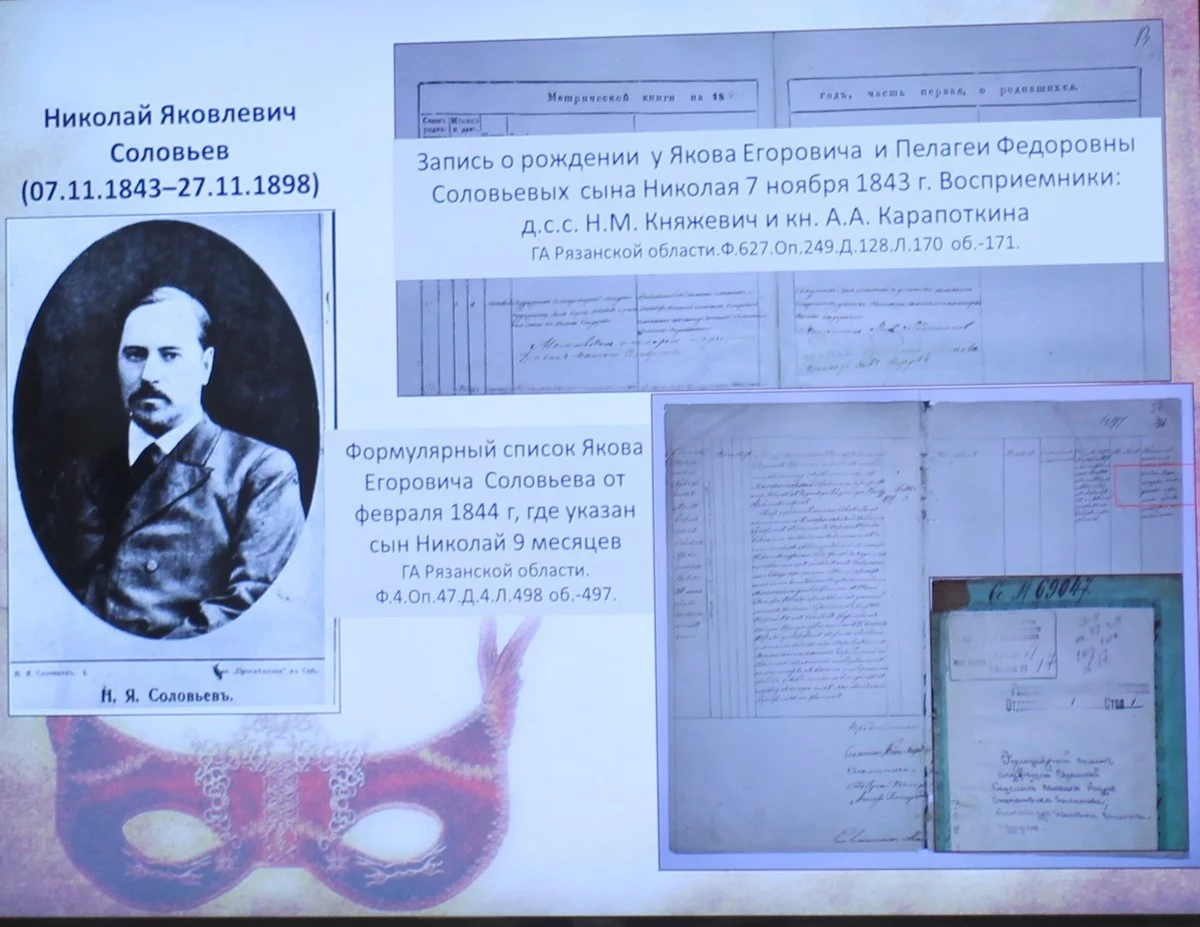Из 55 лет 39 Николай Яковлевич Соловьев прожил в Калужской губернии, а родился он в Рязани. Поэтому краевед Нина Фомина сделала запрос в Рязанский госархив.