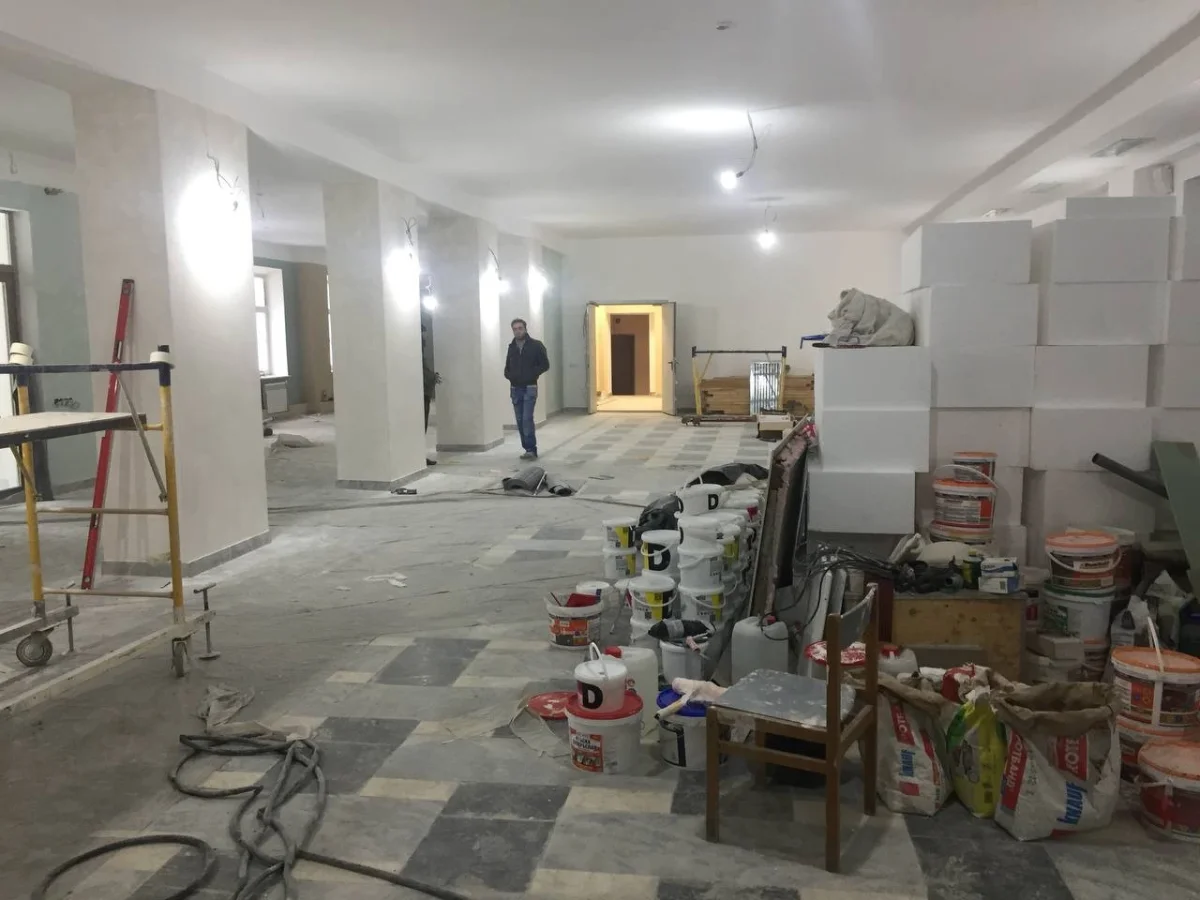 Действительно, все самые объемные реконструкционные работы закончены. Но батареи отопления в большом зале ещё не установлены. Освещение проведено, но осветительных приборов практически нигде невидно.