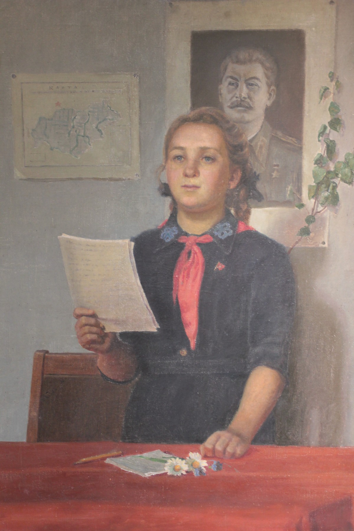 Этот портрет был написан в конце ХХ века неизвестным художником, а потом его порвали и уже собирались отнести на помойку. Сейчас он представлен на выставке, хотя это работа и не относится к 1950-м годам ХХ века, она отлично вписалась в концепцию выставки.