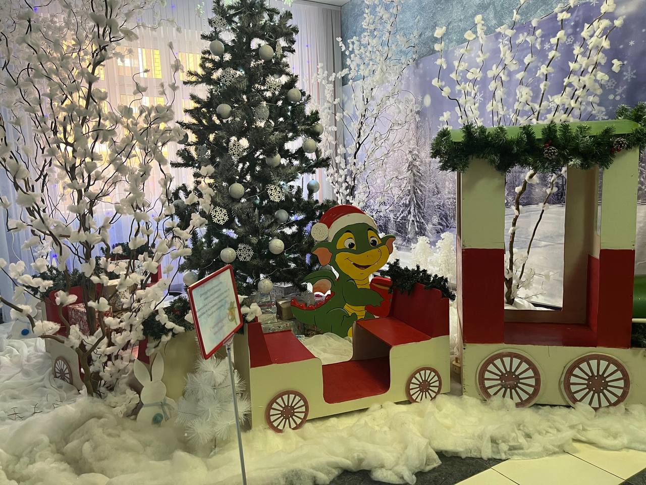 Войдя в детский сад, я на минуту остановилась в недоумении, оглядываясь по сторонам, потому что внезапно попала в сказочный зимний лес, чего никак не ожидала. Повсюду деревья, усыпанные снегом, с ветвей которых свисают зимние бусы из снежинок. Вот по стволу забирается белочка, а внизу, между маленьких елок, замерли заяц и олененок. Слева от меня едет поезд с подарками, а за ним, у елки, главный символ наступающего года - дракон.